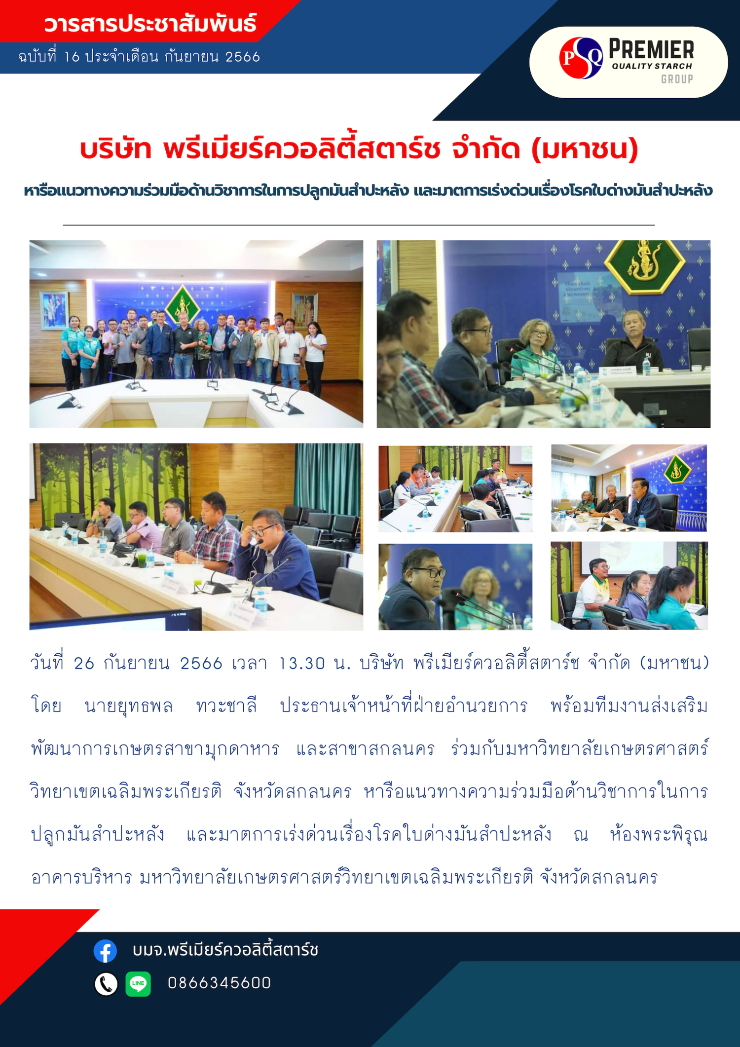 September 26, 2023, at 1:30 p.m. Premier Quality Starch Public Company Limited is owned by Mr. Yuthaphon Tawachali, Chief Administrative Officer, along with the Mukdahan branch agricultural development promotion team and Sakon Nakhon branch. In collaboration with Kasetsart University, Chaloem Phrakiat Campus, Sakon Nakhon Province Discuss guidelines for academic cooperation in growing cassava. and urgent measures regarding cassava leaf spot disease at Phra Pirun Room, Administrative Building, Kasetsart University, Chaloem Phrakiat Campus, Sakon Nakhon Province.