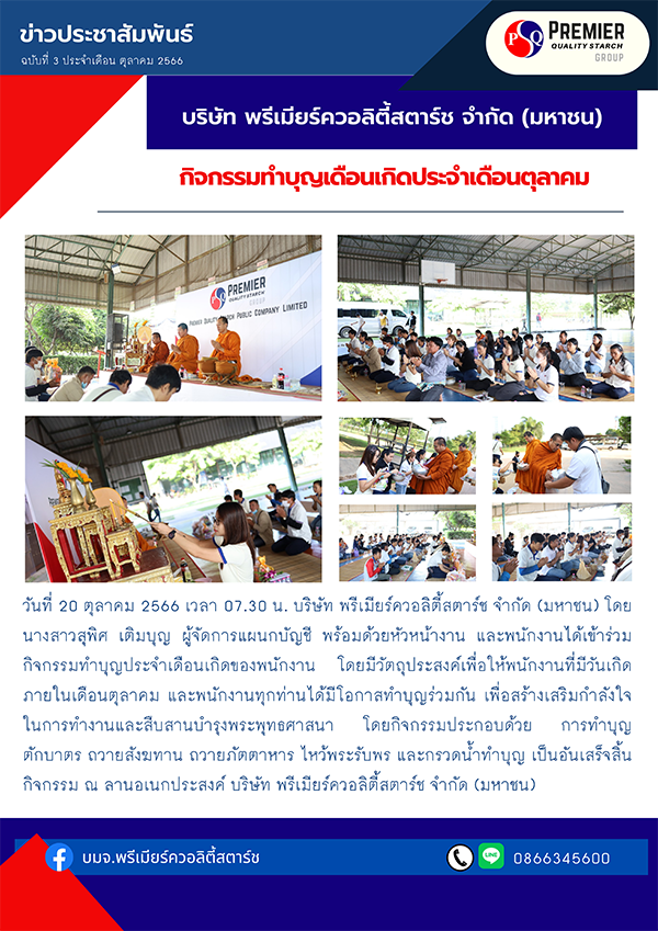 วันที่ 20 ตุลาคม 2566 เวลา 07.30 น. บริษัท พรีเมียร์ควอลิตี้สตาร์ช จำกัด (มหาชน) โดย นางสาวสุพิศ เติมบุญ ผู้จัดการแผนกบัญชี​ พร้อมด้วยหัวหน้างาน และพนักงานได้เข้าร่วมกิจกรรมทำบุญประจำเดือนเกิดของพนักงาน โดยมีวัตถุประสงค์เพื่อให้พนักงานที่มีวันเกิดภายในเดือนตุลาคม และพนักงานทุกท่านได้มีโอกาสทำบุญร่วมกัน เพื่อสร้างเสริมกำลังใจในการทำงานและสืบสานบำรุงพระพุทธศาสนา โดยกิจกรรมประกอบด้วย การทำบุญตักบาตร ถวายสังฆทาน ถวายภัตตาหาร ไหว้พระรับพร และกรวดน้ำทำบุญ เป็นอันเสร็จสิ้นกิจกรรม ณ ลานอเนกประสงค์ บริษัท พรีเมียร์ควอลิตี้สตาร์ช จำกัด (มหาชน)