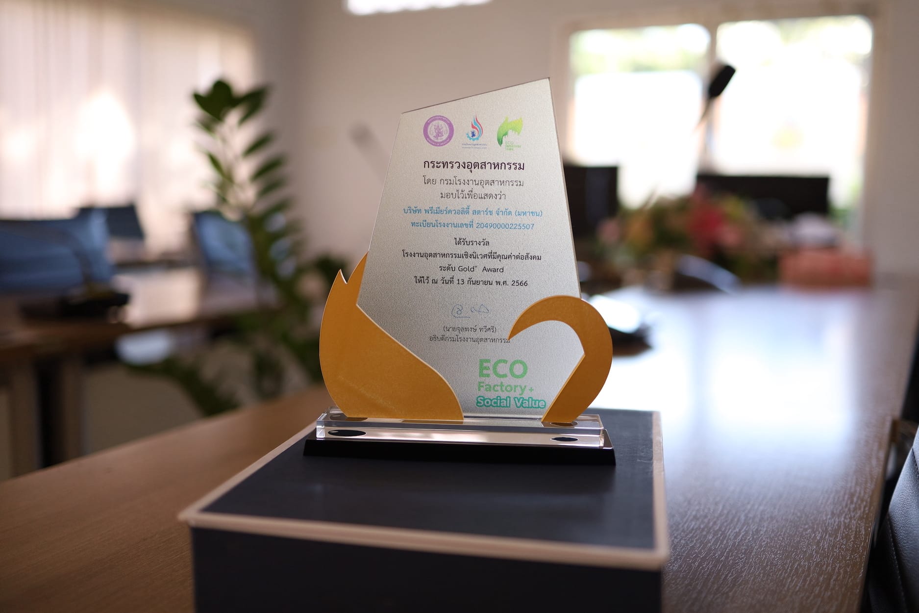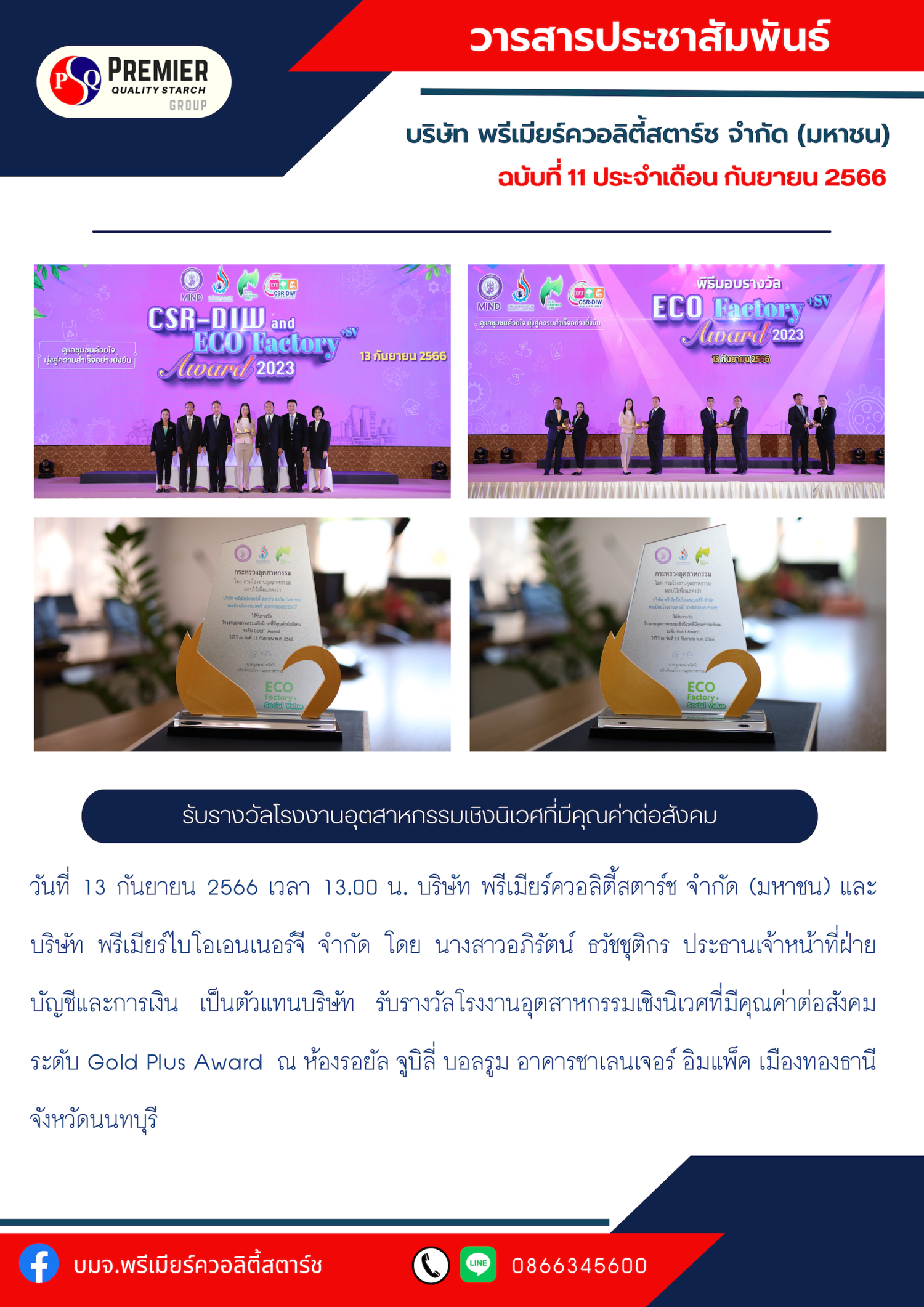 September 13, 2023 Premier Quality Starch Public Company Limited, by Ms. Apirat Thawatchutikorn, Chief Accounting and Financial Officer Representing the company group I received the Eco-Industrial Factory Award that is valuable to society from the Department of Industrial Works, given by Mr. Chulphong Thaweesri, Director-General of the Department of Industrial Works, as an award that represents the success of industrial factories with social and community responsibility. Premier Quality Starch Public Company Limited received the Gold Plus Award, and Premier Bio Energy Company Limited (an affiliated company) received the Gold Award. At the Royal Jubilee Ballroom, Challenger Building, IMPACT, Muang Thong Thani, Nonthaburi Province.