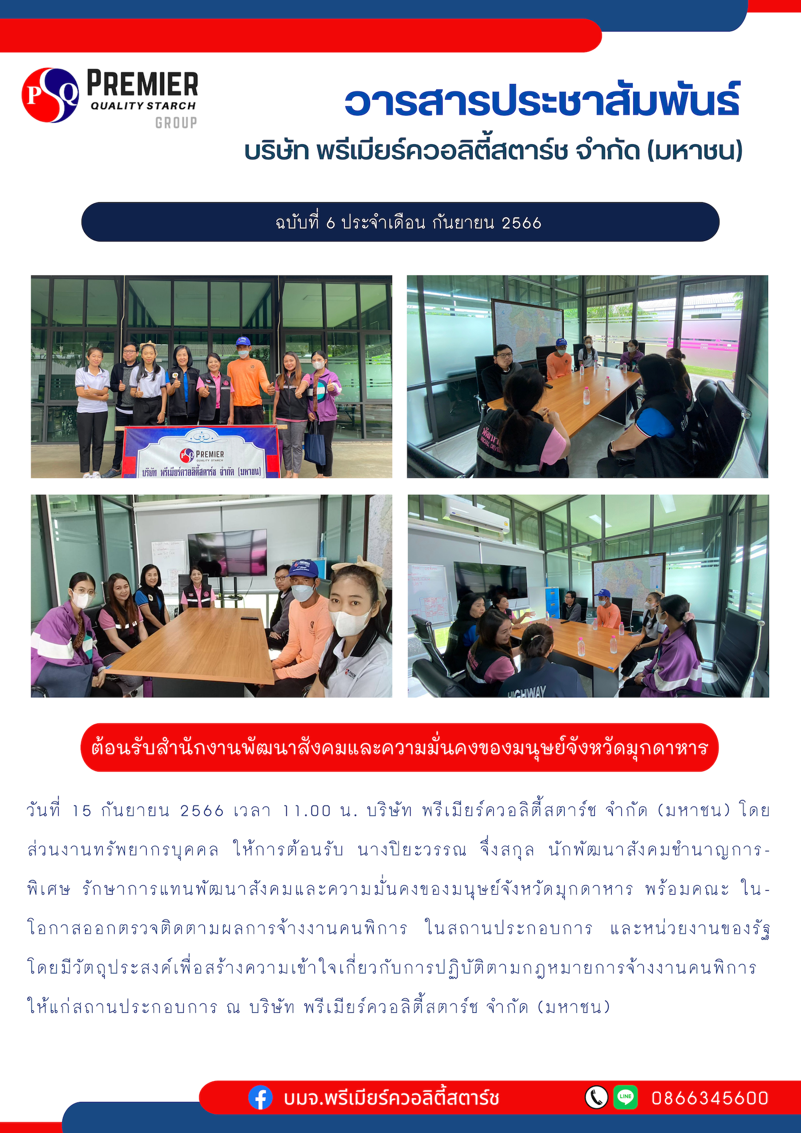 On September 15, 2023, at 11:00 a.m., Premier Quality Starch Public Company Limited was invited by the Human Resources Department to welcome Mrs. Piyawan Jungsakul, Social Development Specialist, Acting Social Development, and Human Security Representative of Mukdahan Province, along with a team, on the occasion of inspecting and following up on the employment of people with disabilities. in the establishment and government agencies. The objective is to create an understanding of compliance with employment laws for people with disabilities. for establishments at Premier Quality Starch Public Company Limited.